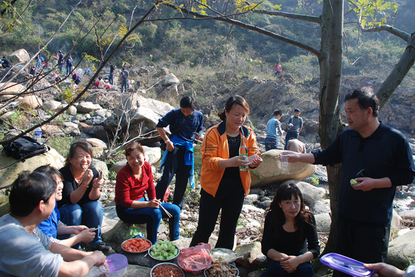 在自由活動時間,有的人挽起褲腳跳入水中,歡快地到處捉泥鰍、逮螃蟹,有的拾柴埋鍋做飯,有的拍照合影留念,有的放線垂釣,有的打牌娛樂休閑,有的高歌一曲現(xiàn)場助興。公司工會副主席王友志、女工主任丁玲先后到上下游各片區(qū)看望大家,并再三叮囑注意環(huán)境衛(wèi)生。之后大家吃著自己制作的豐盛午餐舉杯共飲,這正是秋游健走逛美景,其樂融融賞心悅。